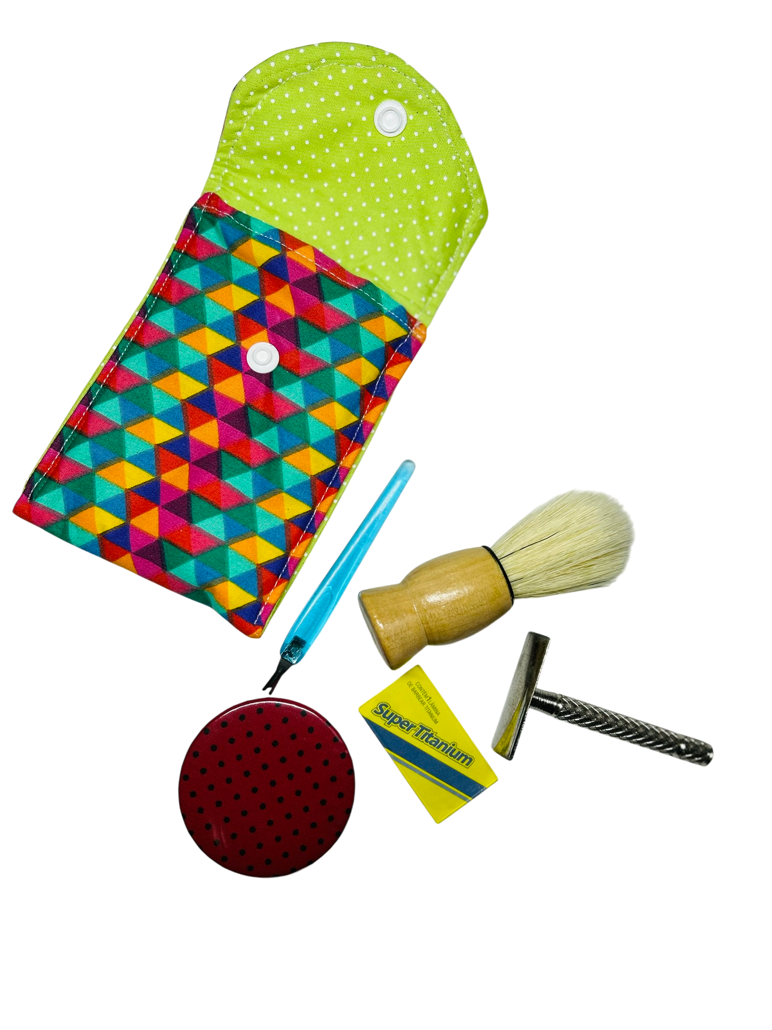 Acompanha espelhinho, barbeador, pincel de barbear, afastador de cutícula e bolsinha!
