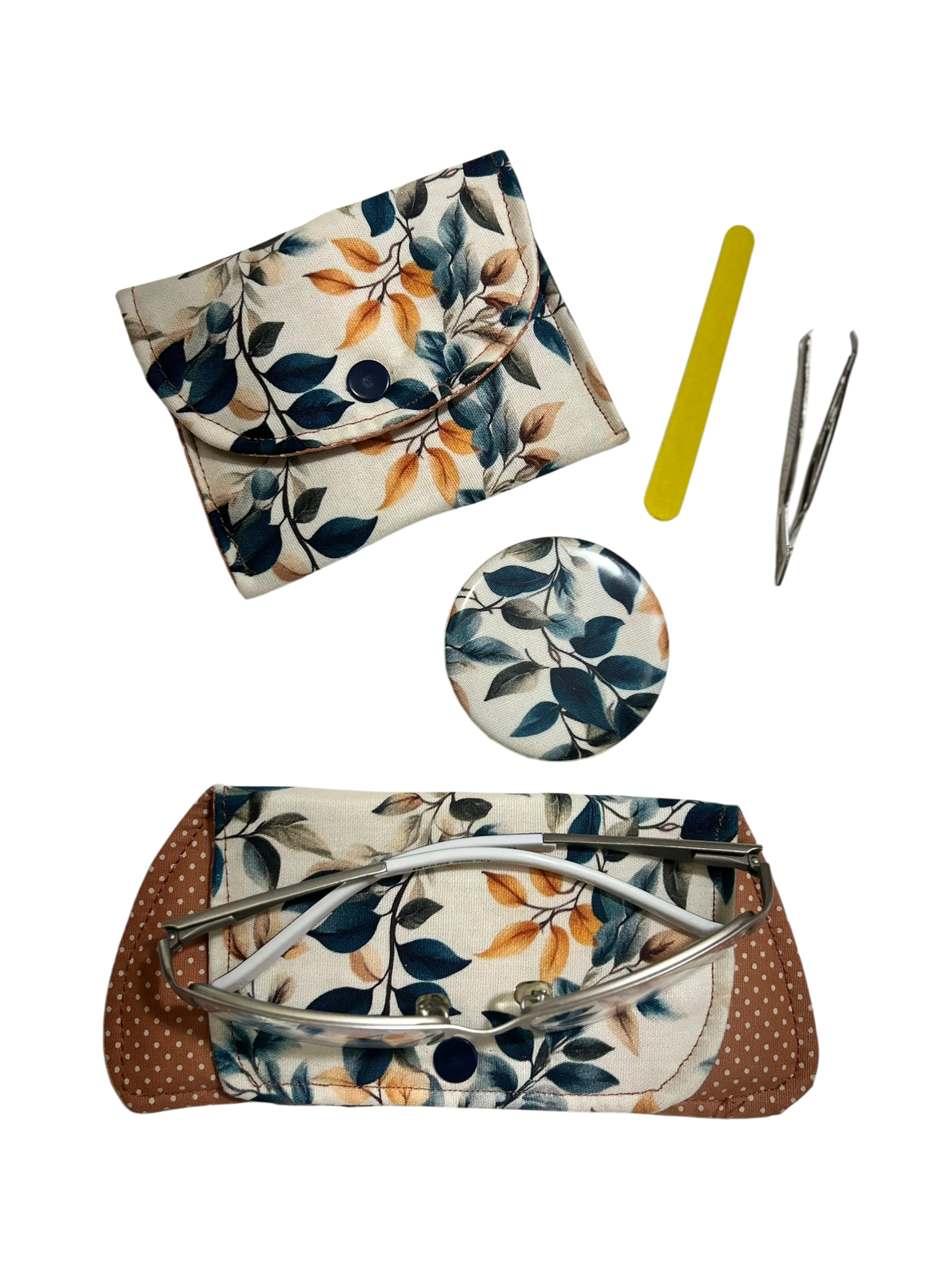 Kit emergência para bolsa é ideal para presentear a amiga e garantir que tudo ficará bem, afinal pinça, lixa e espelhinho são essenciais! Acompanha pinça, porta lixa pequeno e bolsinha!