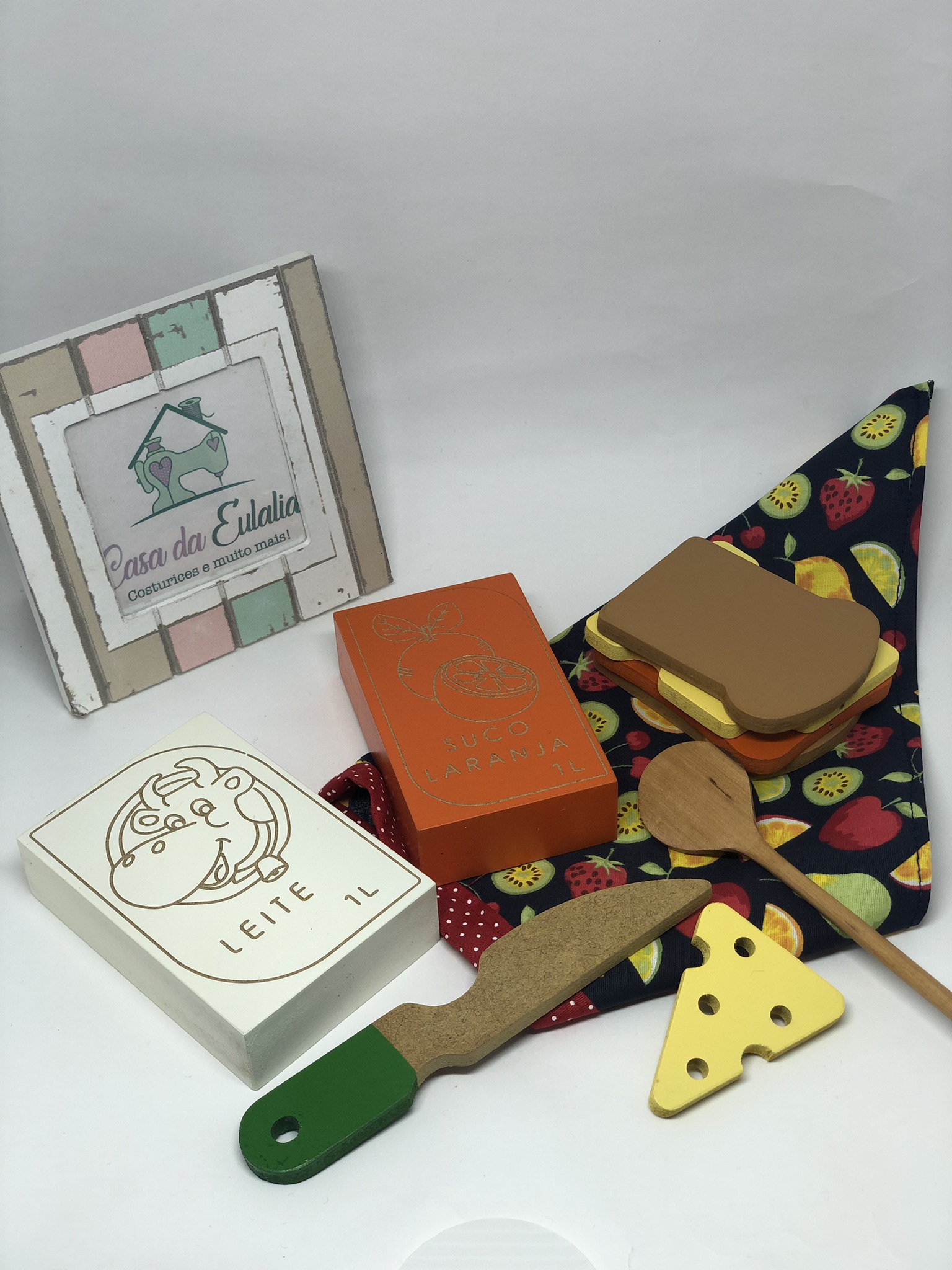Acompanha brinquedos em madeira: 1 faca, 1 colher, 1 sanduíche, queijo, 1 leite e 1 suco de laranja.