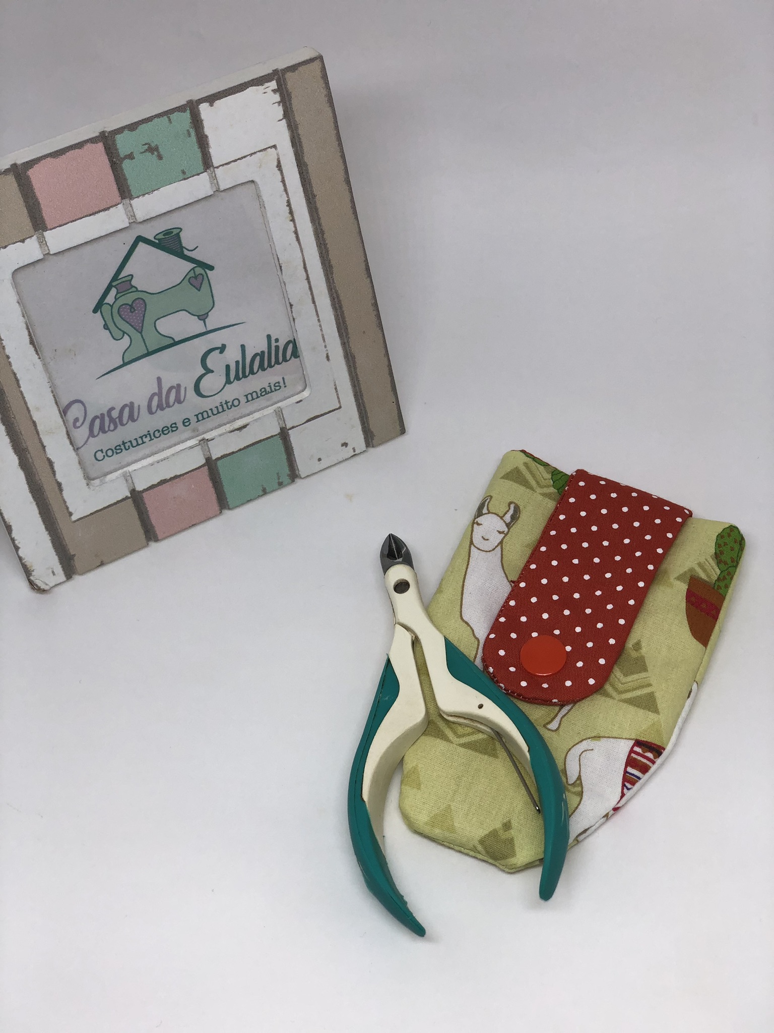 Porta alicate de unha, feito de tecido de algodão e acolchoado, fechamento por botão de pressão.