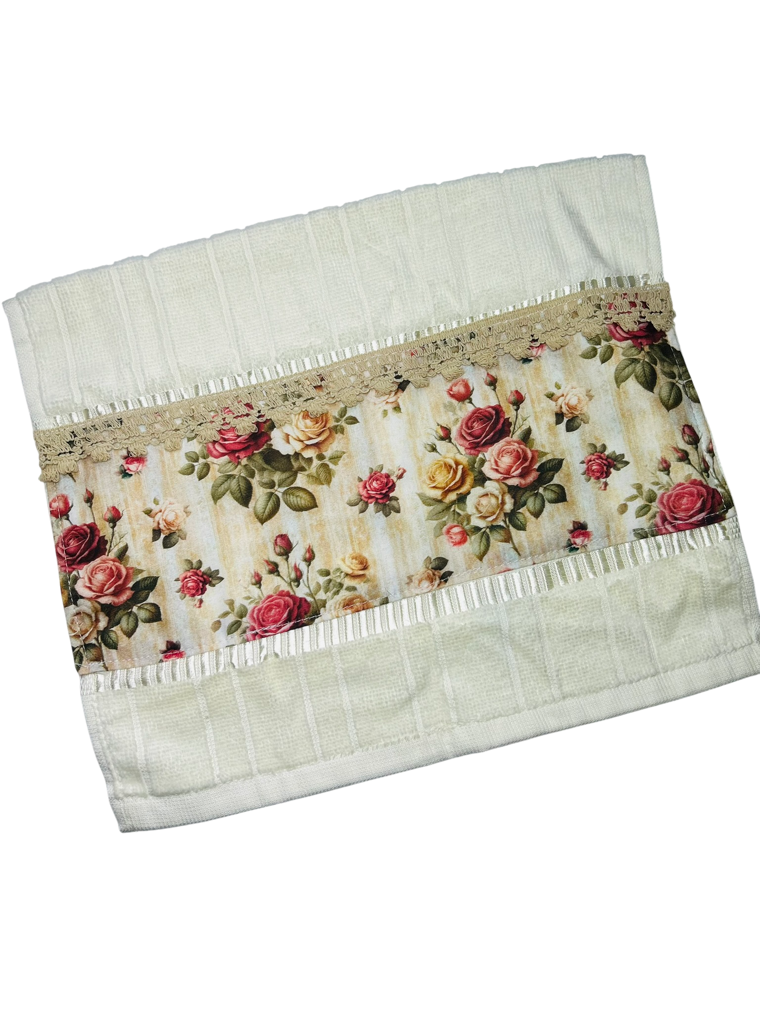 Toalha felpuda aveludada de toque macio e confortável, com barra em renda guipir. Seu lavado ficará elegante!