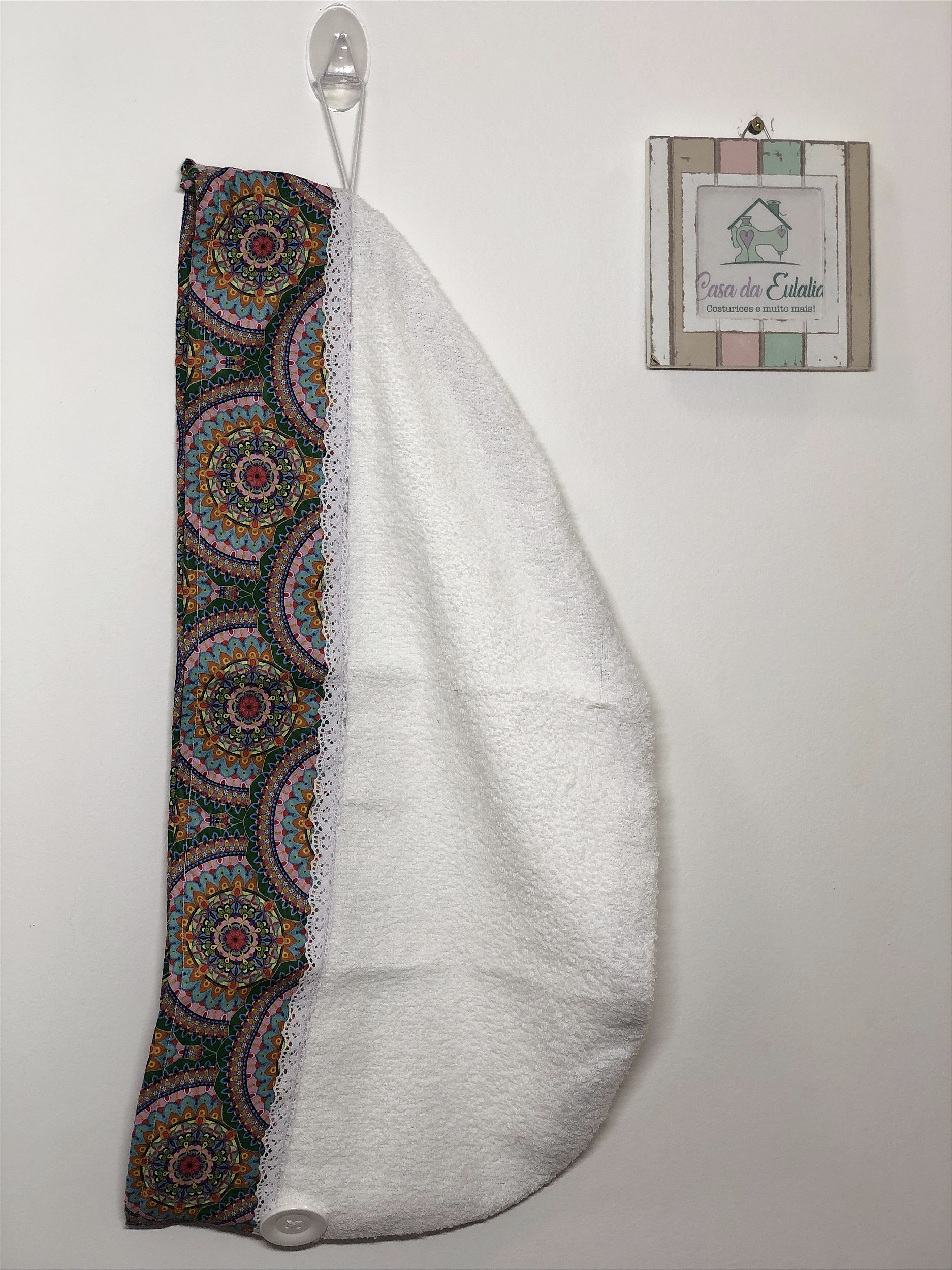 Touca de banho, feita com borda em tecido de algodão e toalha.