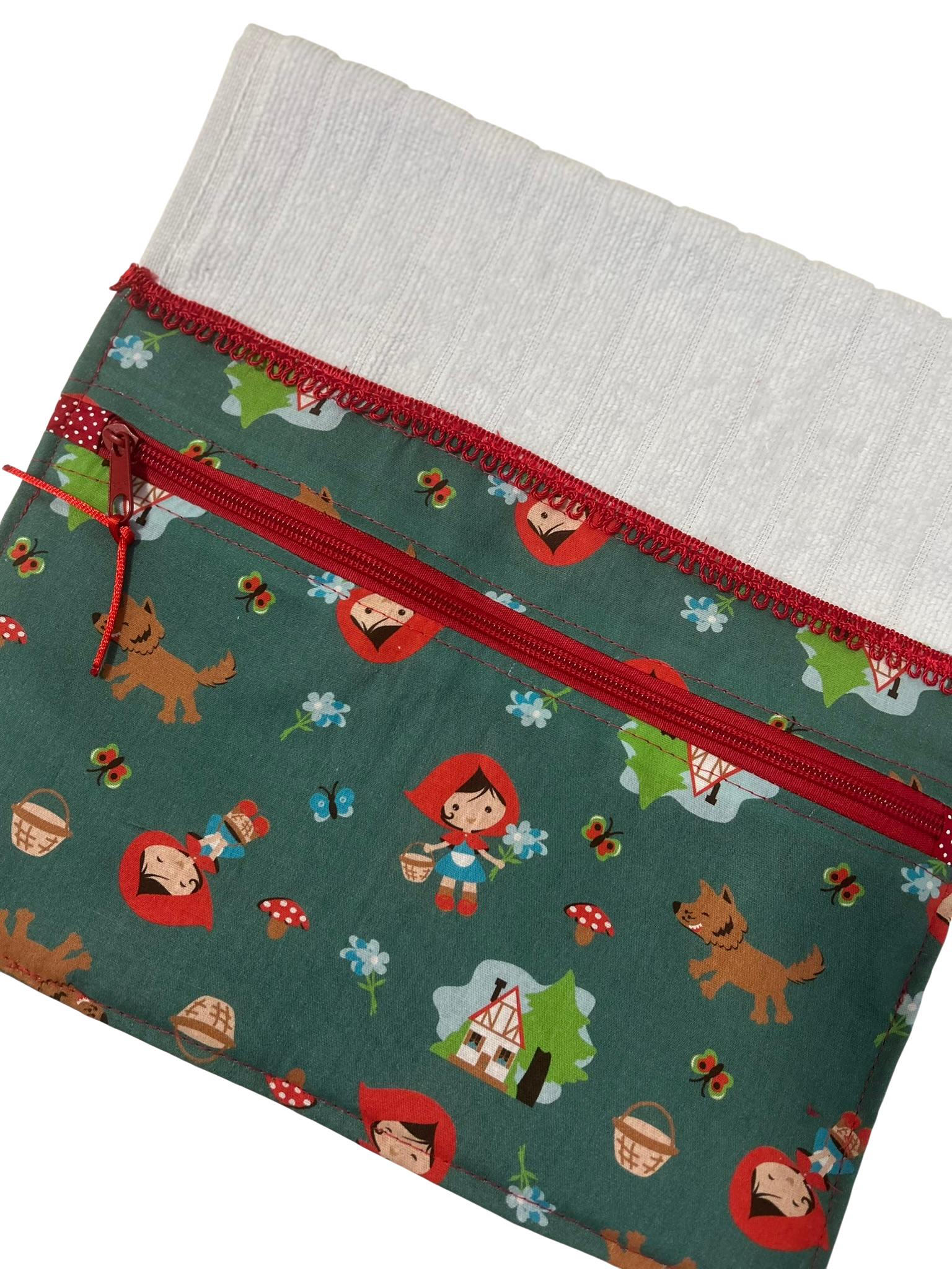 Confeccionada em tecido 100% algodão com bolsinha para armazenar escova e pasta. Fechada com zíper.
